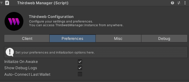 The ThirdwebManager is a prefab that provides a convenient way to instantiate the ThirdwebClient, and contains helper functions to create contracts and wallets. Add the prefab to your scene and the client will persist throughout your game's lifecycle, keeping track of your connected wallets.